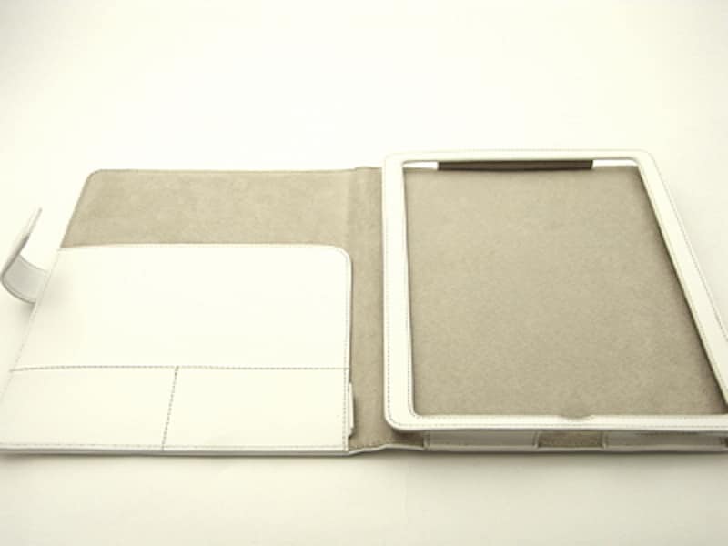 | 中は、iPadの収納部分の他、フラップの裏側は書類や名刺を入れられるポケット付き。A4二つ折りの用紙が収納可能。 |