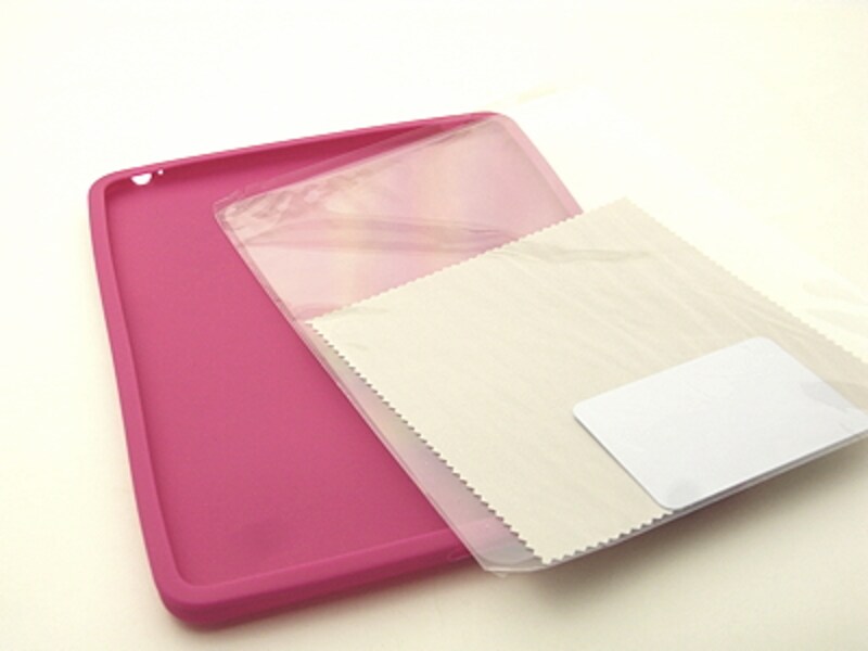 | シリコンケースの他、保護フィルム、フィルムを貼り付ける際に使うクロスと気泡抜き用の板も付属する。 |