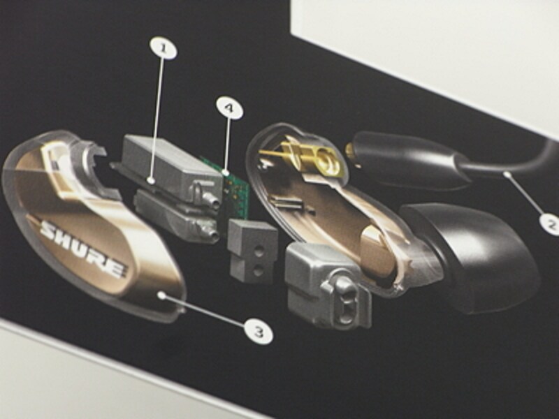 さらに、今回の新作では、ドライバとケーブル部分が着脱出来るだけでなく、クルクルと回転します。これが結構すごい事で、装着時にケーブルが捩れたり捻れたりしないのです。これは、ケーブルにかかる負担が少なくなるので断線しにくくなる上に、装着時の引っ張られる感じも少なくて済む画期的な一石二鳥策。発表会でShureの方も言ってましたが、ガイド納富も、このドライバとケーブルの接続部分が回転するイヤフォンを他に見た事がありません。断線は、このドライバとケーブルの接続部分か、ケーブルとステレオミニプラグの接続部分で起こる事が多いのですが、その片方、正確に言えば三分の二が断線しにくくなっているわけです。