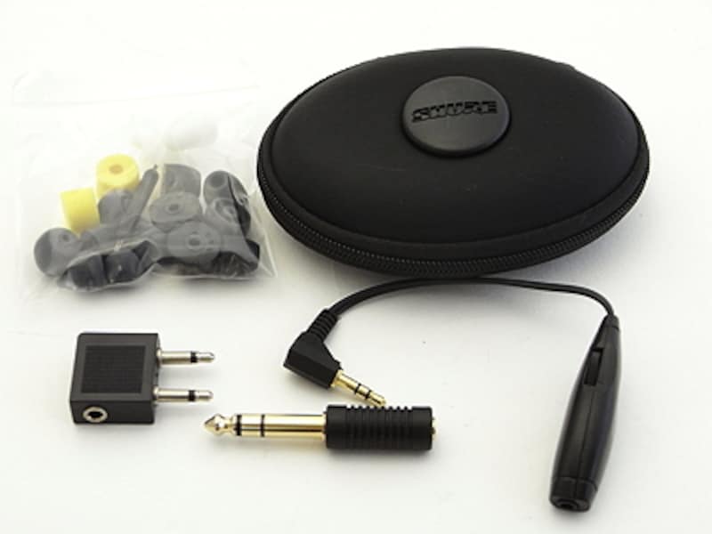 | 付属品は専用ポーチとプラグアダプター、レベルコントローラー、航空機内用アダプターに、各種イヤーパッド |