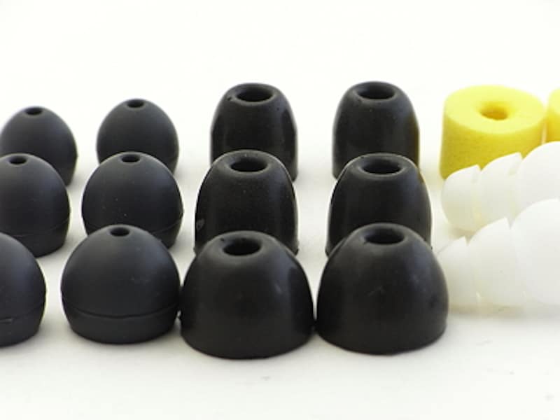 | イヤーチップは、フォーム・イヤパッド、ソフト・フレックス・イヤパッドが各S、M、Lの3種類。さらに黄色の円柱形のフォーム・イヤパッドとトリプルフランジ・イヤパッドが付属する |