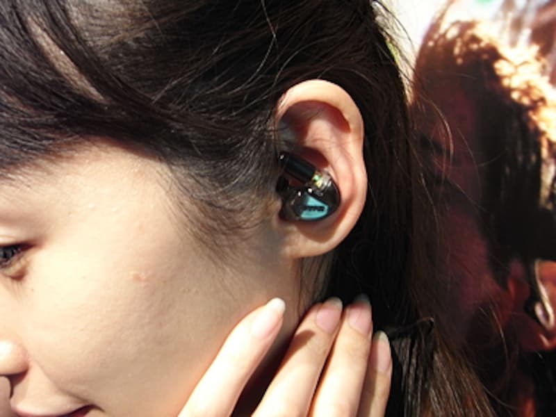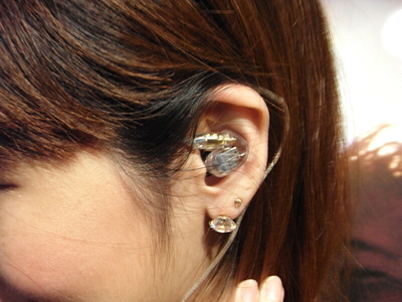 | 装着例。耳を回る部分は、ワイヤーフォームフィット機能で、耳の形状に合わせてある程度固定出来る。クリアタイプは目立たず、女性が付けてもファッションの邪魔にならない |