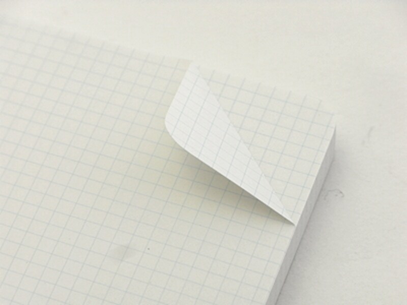 リフィル部分は、この手のブロックメモとしては珍しく、四隅が角丸になっています。そのため、一筆箋として人に渡すのにも向いています。中も、無地と10mm方眼の二種類から選べるようになっています。特に、箇条書きに便利な10mm方眼は、メモで採用しているのは珍しいのですが、使ってみると、罫線としても、地図や表を書く際のガイドとしてもとても使いやすいものでした。コンセプト通りの、「手のひらの上の考え事スペース」と言えるメモパッドになっていると感じました。書いたメモを一時的に収納出来るポケットが付いているのも実用的です。