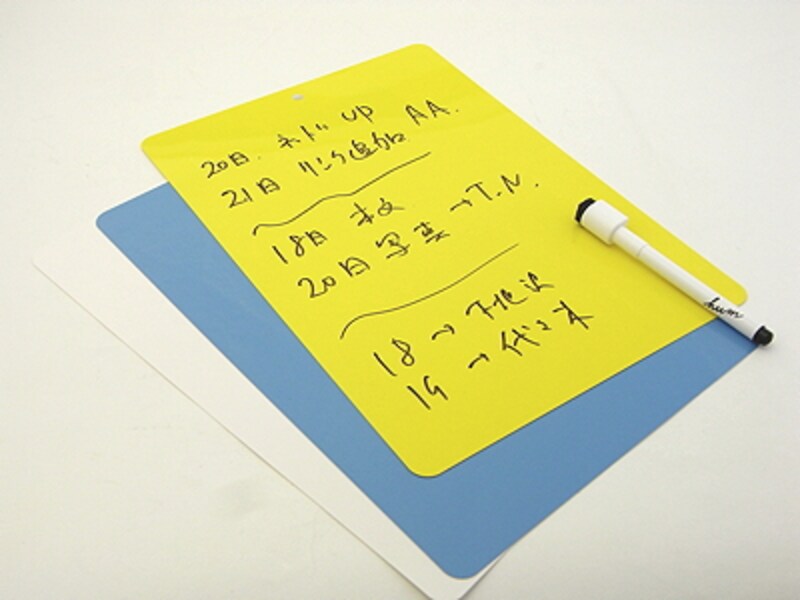 | ファイルフォルダの中にほぼA4サイズの4枚のホワイトボード(色つきですが)が入っている。 |
