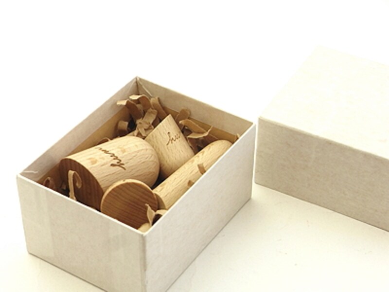 | 6個の木のマグネットが、おが屑のような緩衝材と共に箱に入っている |