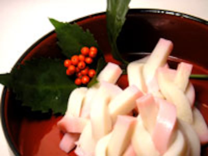 かまぼこは昔は「貴族の食べ物」だったというくらい高級食材だったそうです。お節では紅白ということで新春の喜びを表現するのに使用。このかまぼこに一工夫することで、さらに縁起のいいメニューにすることができます。今回は「結び」という飾り切りの中でもかまぼこ自体を結び型にする飾り切りをご紹介します。