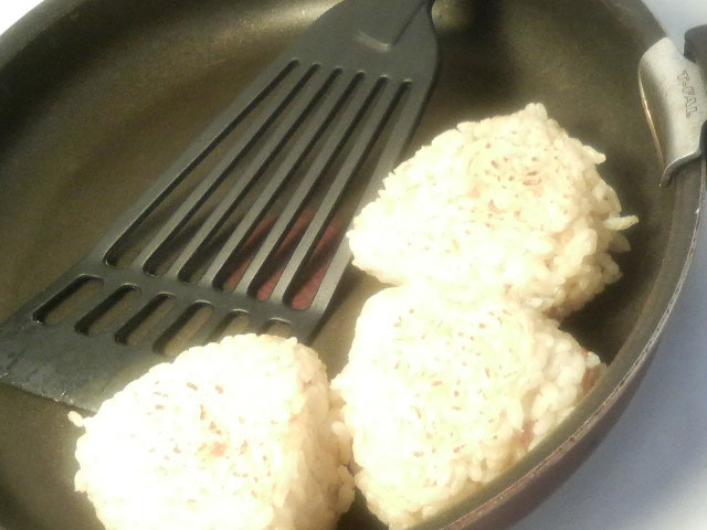 おにぎりを焼く際にフライパン返しを使うと形が崩れなくて便利ですよ。