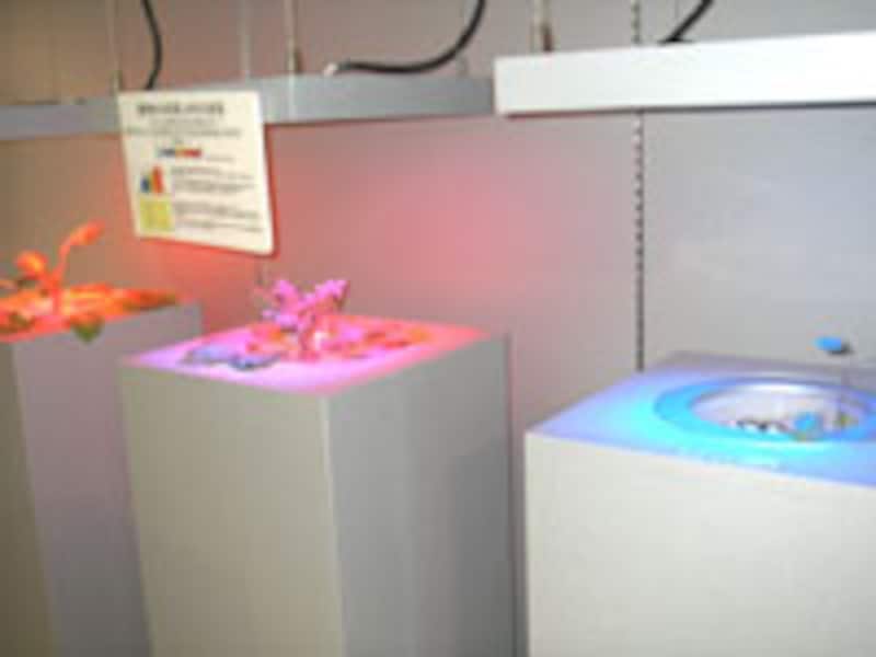 | (上)同じように育てても光の色の違いでそれぞれに成長の違うコールラビ。(下)同じくコールラビを色違いの光で育てているところ。計6色の光による実験結果、驚くほどの違いですね。 |