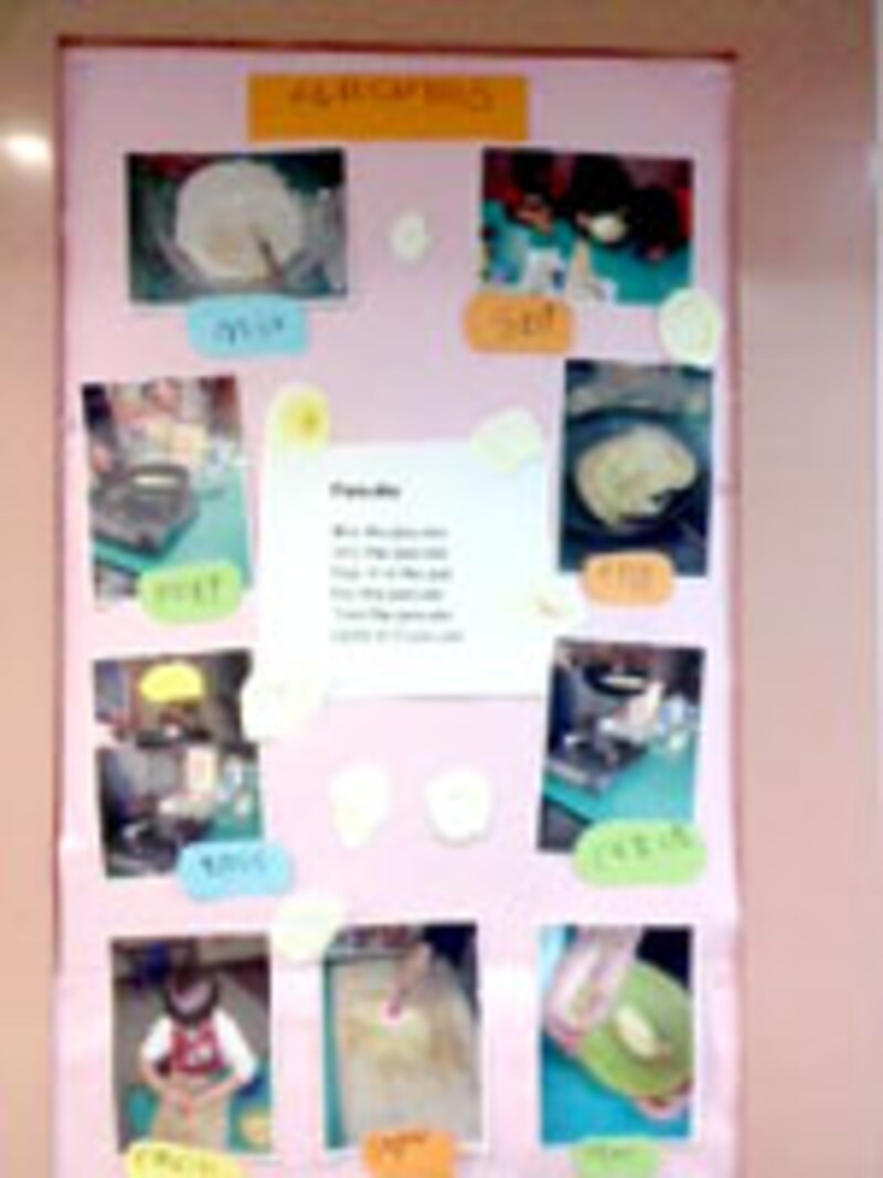 | クレープ作りを手伝った子どもの様子が展示されていました |