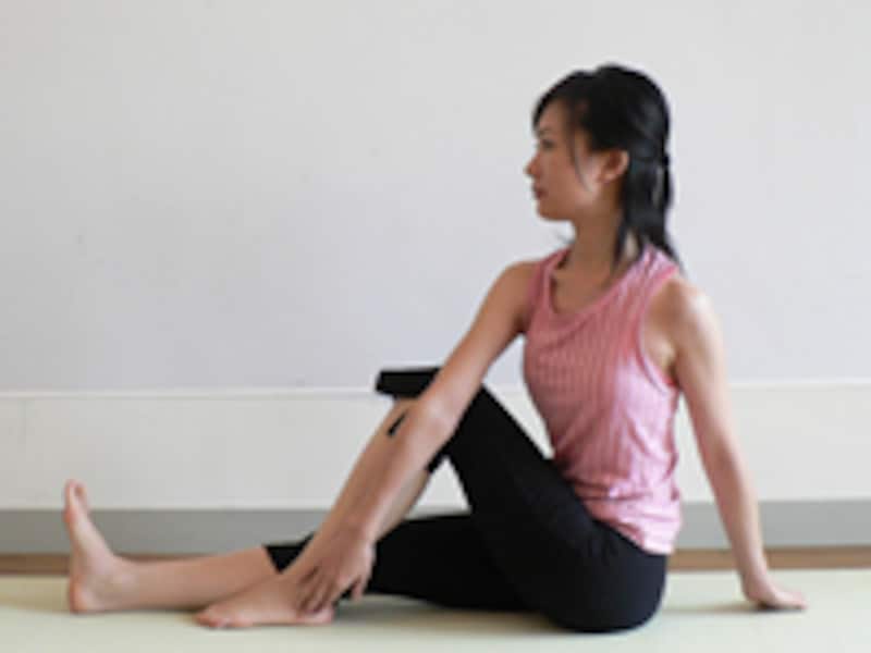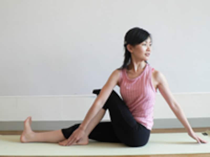 美しい背中のシルエットには欠かせない、背中の引き上げはもちろん、腹部の血行がよくなるので、腰痛にも効果的。腰からしっかりと背骨をねじり、姿勢と内臓の働きを同時に改善していきます。【ねじりのポーズ】
