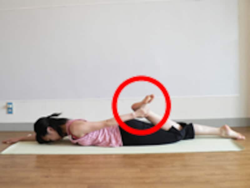 *可能な人は、足首を曲げかかとを写真のように突き出します。無理な場合は、かかとを突き出さず、足首をしっかりと持ちましょう。