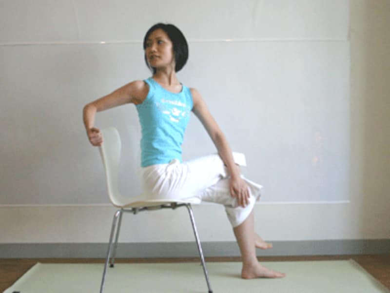 <息を吐きながら>背骨を右へねじってキープ。この姿勢でゆっくり丁寧に5呼吸します。