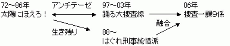 「22時33分、船越英一郎は犯人の告白を聞く」で2時間サスペンスについてまとめてみましたが、今回は連続もののミステリードラマ。 主軸は『太陽にほえろ』から『踊る大捜査線』へまずは70年代が全盛期だった古典的スタイルの刑事ドラマの代表作だった『太陽にほえろ!』。 このアンチテーゼとして生まれたのが『踊る大捜査線』。今までにない刑事ドラマをつくるべく『太陽にほえろ!』が確立したパターン、刑事にニックネームをつける、音楽に載せての聞き込みシーン、刑事が犯人の心情を理解して悩む……といったものを禁じ手に。その上でリアルな刑事ドラマにするため刑事もサラリーマン、警察は会社、本庁が本社で所轄は支店という構図ができあがったのでした。 一方70年代刑事ドラマの生き残りなのは『はぐれ刑事純情派』、05年に連続ドラマとしては完結しましたが、スペシャルとしては続きさすがのしぶとさ。 しかしテレビ朝日系水曜21時枠も今年の『警視庁捜査一課9係』など『踊る大捜査線』の影響を受けてかなり現代的になっています。70年代からの流れもは藤田まことが現役の間のみか。 ![]() 「踊るレジェンド」シリーズ一挙放送さて10月には『踊る大捜査線』からスピンオフしてできた「踊るレジェンド」シリーズが10月に新作も加わり一挙放送されます。放送されるのは4作。 10月14日 映画『交渉人 真下正義』 10月20日 映画『容疑者 室井慎次』 10月21日 スペシャル『逃亡者 木島丈一郎』(再放送) 10月28日 新作スペシャル『弁護士 灰島秀樹』 新作の『弁護士 灰島秀樹』は『容疑者 室井慎次』で室井を追いつめた勝訴のためには手段を選ばない悪徳弁護士。主演は八嶋智人。 |