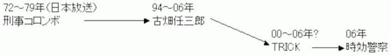 勝負はトリックじゃなくトークミステリーといえば犯人を見つけていくパターン、推理小説でいうところの「本格」形式が主流です。しかし連ドラで一話完結形式の場合は『金田一少年の事件簿』など原作ものでは成功例がありますが、オリジナル作品での成功例はあまりありません。これはおそらく毎回、トリックを考えるのがミステリーの専門家でもない脚本家にとってはたいへんだからでしょう。それより一話完結の連ドラ向けなのは、犯人が最初からわかっている「倒叙」形式か、わかってないまでもほとんどキャストを見れば犯人がわかるというもの。 この源流はアメリカのテレビシリーズ『刑事コロンボ』。ロサンゼルス・ビバリーヒルズ界隈を中心に「勝ち組」が起こした殺人事件をコロンボが風采のあがらない姿で油断させながら犯人を心理的に追いつめるというスタイル。トリックよりも会話がメインなのがテレビドラマ向きです。パクリではなくオマージュこのパターンをそのまま使ったのが『古畑任三郎』。主演が田村正和だから風采があがらなくはないけど、犯人は成功者で会話で対決しながら追いつめていくというスタイルはまったく同じです。『TRICK』は犯人は最初からわかってるわけではないけど、ほとんどの事件でもろわかり。探偵役の貧乳の自称天才マジシャン・山田奈緒子(仲間由紀恵)とワトソン役・態度はでかいが気は小さい物理学者・上田次郎(阿部寛)のコンビもますます冴えているんだか冴えてないんだかわからなくなっています。 そして『時効警察』はさらにゆる~く、すべてのレギュラーメンバーがボケているとぼけたドラマに。『TRICK』に続くシリーズになることを期待したいところですが、その場合の難点は時効事件を扱うため殺人なら15年前を描かなくてはいけないという縛り。若い女性が犯人の場合、15年前と現在を両方こなせる女優が限られてきます。すでに永作博美、池脇千鶴という日本で一、二を争う童顔女優を使ってしまったので後が苦しそう。 ![]() 2時間サスペンスの元でもあるちなみに『刑事コロンボ』、アメリカでも1時間を越える単発ドラマを確立したシリーズで、このヒットの影響で「土曜ワイド劇場」が生まれたという2時間サスペンスの祖でもあります。土曜ワイド第一作『時間よ止まれ』は風采の上がらない刑事(渥美清)が時効目前に今は金持ちになった犯人(小林桂樹)を追いつめるというコロンボを思わせるストーリーでした。 「踊るレジェンド」の次は「ドラマレジェンド」 さてフジテレビは「ドラマレジェンドスペシャル」として過去の名作ドラマをプライムタイムに放送することを発表しました。その第一弾は『古畑任三郎 VS SMAP』。SMAPが架空のアイドルグループ「SMAP」として犯人役として出演するという作品。 他にシリーズの名場面や古畑任三郎の人間像を浮き彫りにする企画を盛り込むなど単なる再放送ではないそうで、ドラマ自体の再編集の可能性もあるとか。 放送は10月9日(体育の日)の21時から。 |