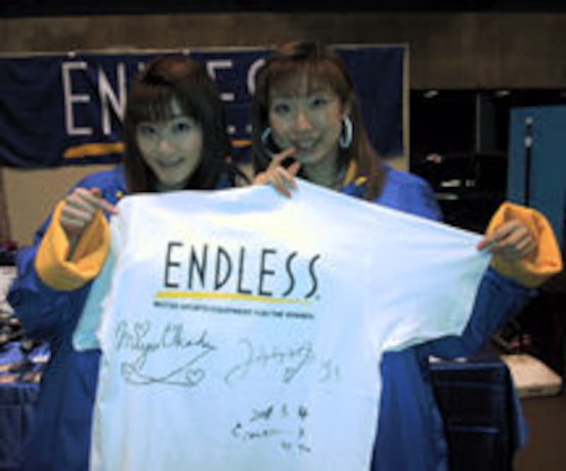 それ以外の時間帯でもENDLESSブースにて受付業務。殆ど丸1日出ずっぱりというハードスケジュールにも関わらず、時々訪れるファンにも気軽にサインをしたり、記念写真に収まったり。まるでENDLESS LADYになった喜びを満喫するかのように笑顔で応えていた。