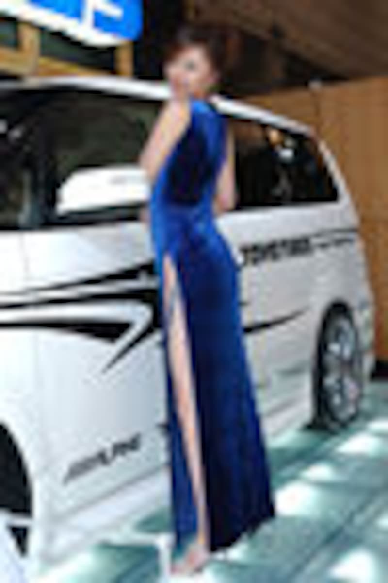これまで人気レースクイーンを使った華々しいステージを展開してきた「TOYO TIRE」ブースですが、今年はモデルさんを使ったフォーマルな演出で魅せてくれました。ロングドレスを着たお2人がステージモデルさん。黒のスーツを着ているのが受付嬢。共にスリットがポイントのようです。