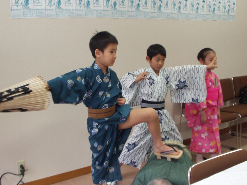 | 子供歌舞伎に挑戦する少年少女たち。「子供たちは吸収が非常に早い。大人に教えるよりのめりこんで夢中になった。子供とはいえチケット代もいただく興行。みんな厳しい稽古に励んでいる」(大谷桂三丈) | 大谷桂三師匠に型を教わる子供たち。 |