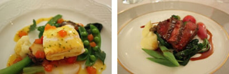 | (左)虎杖浜産平目のブレゼ ソースアンティボワーズ。(右)十勝といえばこの食材。十勝牛のロースト マデラ酒のソース。 |