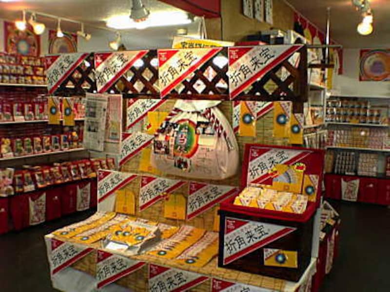 宝当乃館店内左側に、宝くじ販売専用カウンターは在ります。宝くじを購入出来ることは勿論のこと、更に店内には元祖宝当袋をはじめ売場オープンにあわせて、新登場した当せん祈願グッズ「折角来宝(せっかくきたから)」500円など、訪島の記念にお土産品などが揃っています。前のページへ123次のページへ