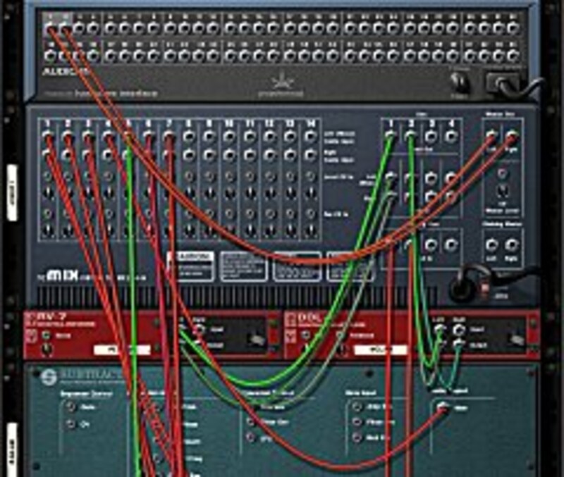 さらに、Reasonのすごさ、ラックの裏側をのぞくとよく分かります。そう、それぞれのモジュールが、ケーブルで接続されており、その配線によって音を変化させることができるし、その配線しだいで、音が出たり出なかったりするのです。ユニークなのは、その配線をすると、ケーブルが揺れたりするところまで表現していること。使っていて、本当にリアルな感じがするのです。もちろん、こうした配線を理解することも、シンセを理解する上で、非常に重要なことなのです。
