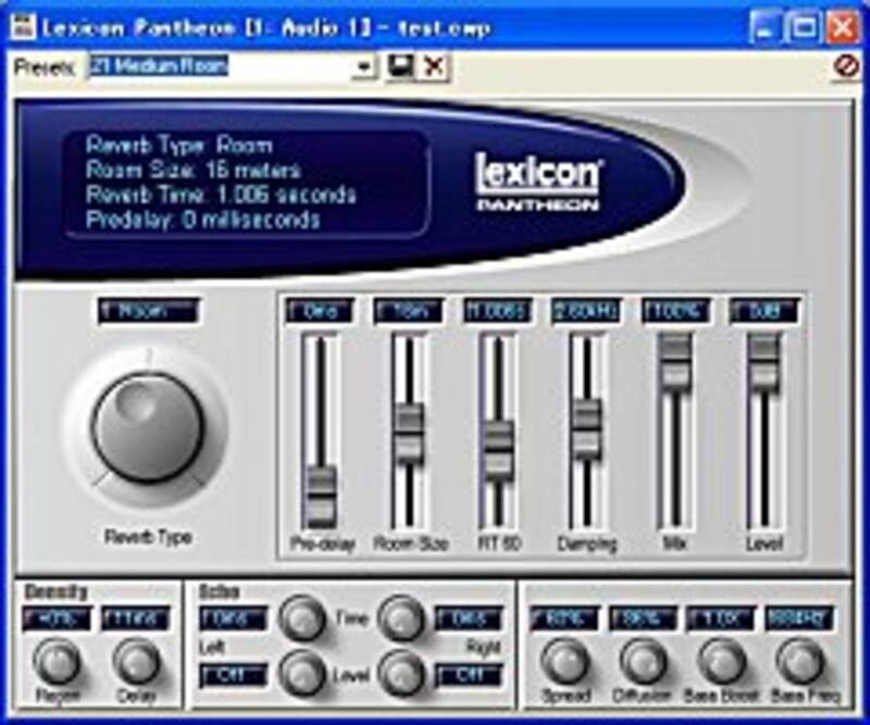 SONAR 3になり、強化された機能として、プラグインに従来のDirectXおよびDXiに加え、VSTおよびVSTインストゥルメントに対応したのも大きなポイントです。つまり、これによって、Windows用として存在するほとんどのエフェクトとソフトシンセのプラグインが利用できるようになったのです。もっともこれは、SONAR自体が対応したというよりもVSTアダプタというソフトを介してVST/VSTiに対応している構造となっています。このVSTアダプタはもともとFXpansionという会社が開発したものでしたが、今春にCakewalkが買収し、Project5にバンドルしたという経緯があります。現在では主にSONARユーザーに向けにエディロールがダウンロード販売も行っているので、それさえ持っていればSONAR 2でも利用できた機能ではありますが、あらかじめバンドルされているというのは大きなポイントでしょう。■プロ用リバーブのLexicon Pantheon Reverbを搭載