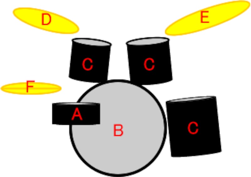 下図は基本的なドラムセットを演奏者から見たところ。イスとスタンド(ペダル)は省略してあります。