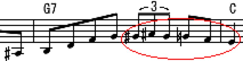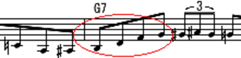 出ました!半音上>全音下>半音下>コードトーン。バップ常套句中の常套句です。全てのキー、全てのコードトーンに解決できるよう仕込むべし!ただし連発してしまうと興ざめですよ。かと言って、ここぞというところでキメるのでもなく、さらりと演奏して下さい。注:譜面はG7の3度であるシに解決しています。 分散和音