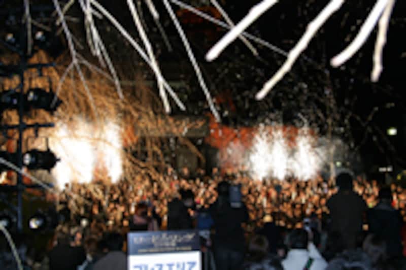 一人一人、ファンにむけて挨拶をした後には、メインイベント!指輪の奉納です。境内を指輪をすてる滅びの山に、その後方にそびえる東京タワーを悪の冥王サウロンにみたて映画のクライマックスシーンを再現。まさに日本ならではの演出。このアイデアをヴィゴ・モーテンセンは大絶賛していました。