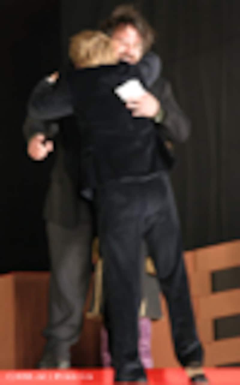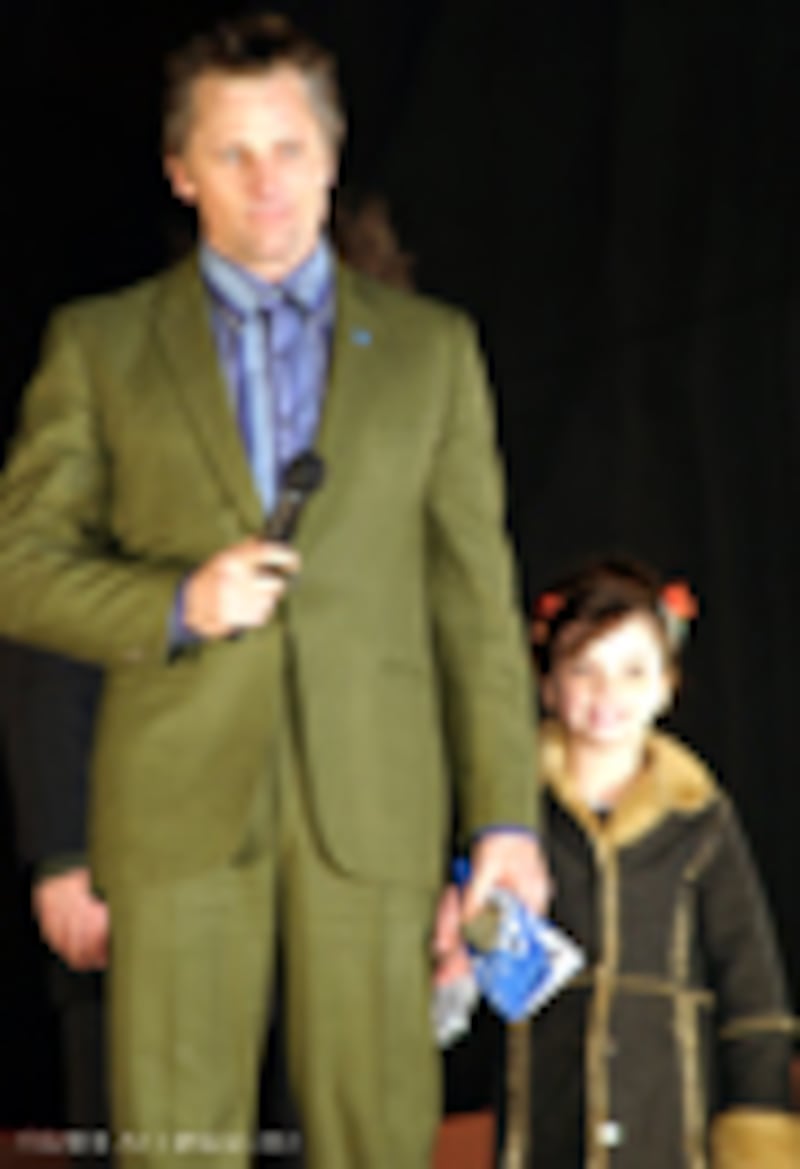 それからピーター・ジャクソン監督が愛娘ケイティちゃんと手をつなぎながら石段を昇っていく。そして段上から一人ずつ名前を呼び、段上に迎えるのでした。まずは、ヴィゴ・モーテンセン!ファンからは「ヴィゴ!ヴィゴ!」とヴィゴコールかかかる。段上にのぼると監督とハグ!続いてビリー・ボイド、ドミニク・モナハン、アンディ・サーキスと続くが、皆、監督とのハグは、かかさない。アンディ・サーキスは、ゴラムの声で「コンバンハ、トウキョーは、ワタシノ、愛しいシト。アリガト」と日本語で言い、ファンを喜ばせた。とりは、イライジャ・ウッド。この時は、ケイティちゃんが可愛い声で「プリーズウェルカム、フロド…イライジャ・ウッド」と呼び声をかけました。会場からは、一斉に「かわいー」の声。*ケイティちゃん映画にも出演されてるんですよ!