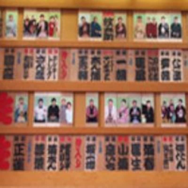 | 出演する芸人名が木札に書かれ、寄席の表、入り口付近や場内に掲げられているのが番組表 |