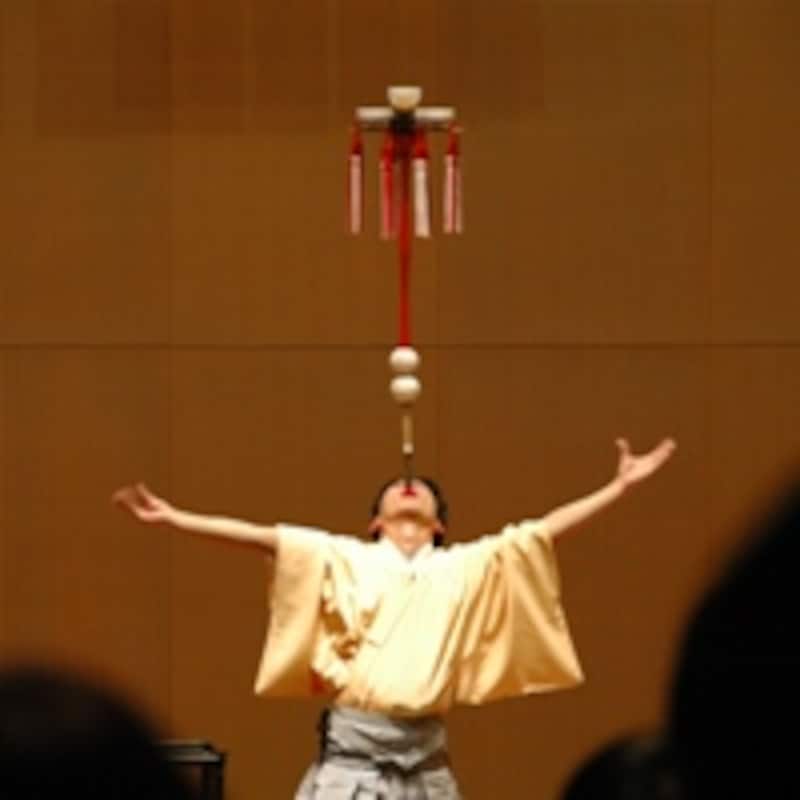 | 世界中で通用するほど凄い芸がこの太神楽。こんなすんごい芸を気軽に生で見られるのが寄席。写真の演者は鏡味正二郎 |