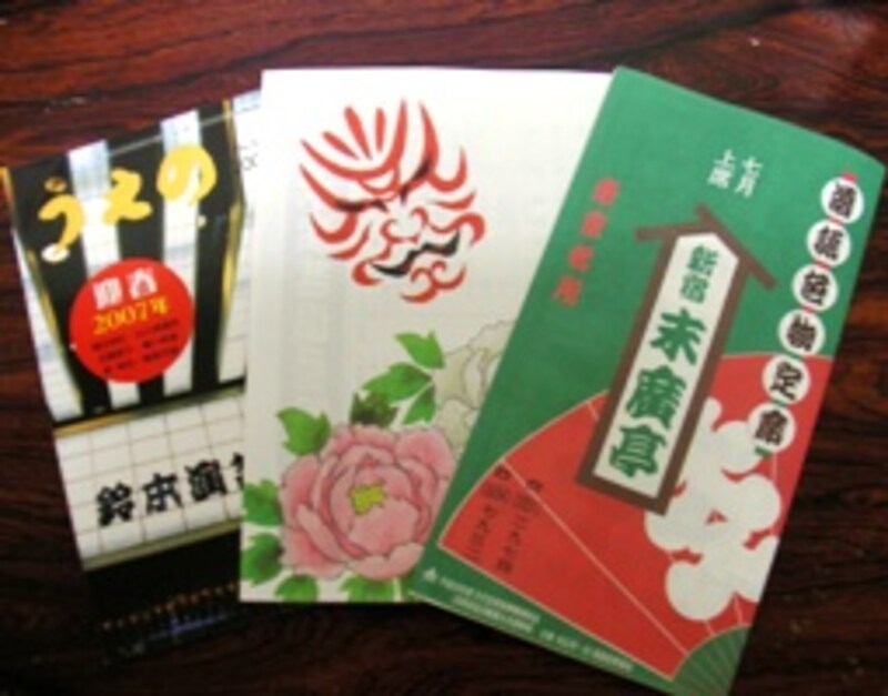 | 寄席のプログラムやチラシスタンドには近所の飲食店の案内があります。 |