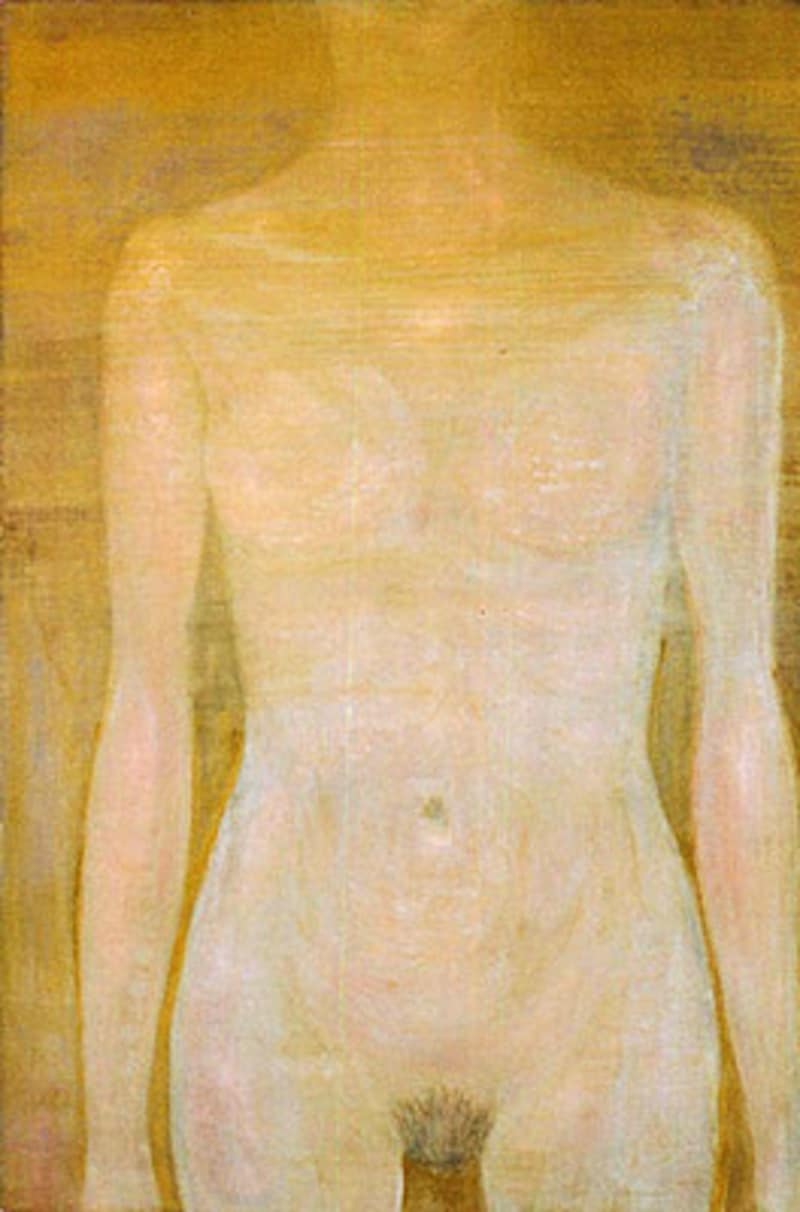 なんとなく小品を選んでみました。この絵についてモデルは特にいません。これを描いた頃、欧州にいて、ヌードクロッキーの授業がよくあり、充実していました。彫刻のように立派な肉体を描くことは楽しかったです。ただそのうち、ぺたっとした平面的で、しかし何とも言えない、実体よりムード優先の裸像を描いてみたくなりました。彫刻ですと、トルソというのがありますが、絵画で「顔のない女」というのを描いてみたいという思いもありました。