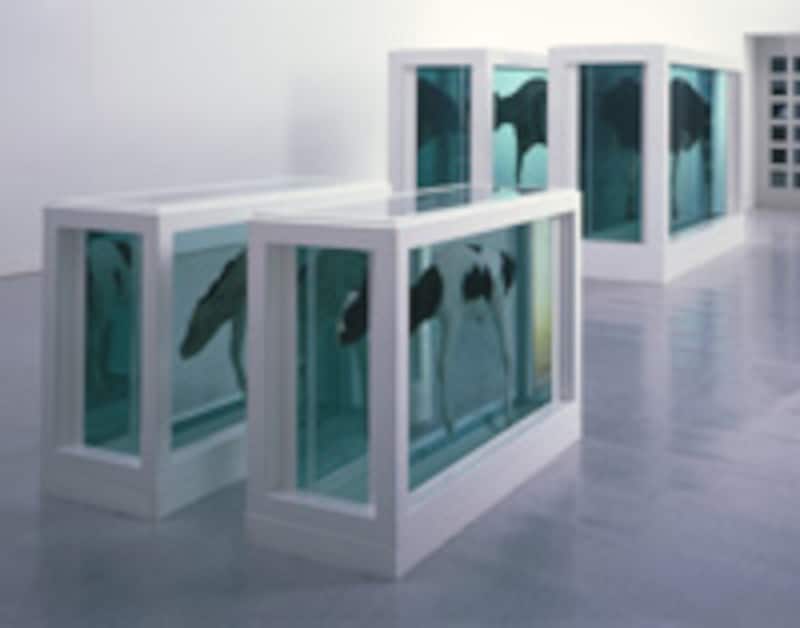 | デミアン・ハースト「母と子、分断されて」1993年/208.6×332.5×109cm(×2)、113.6×169×62cm(×2)/スチール、ガラス強化プラスチック、ガラス、シリコン、牛、子牛、ホルムアルデヒド溶液 アストルップ・ファーンリ近代美術館、オスロ蔵 |