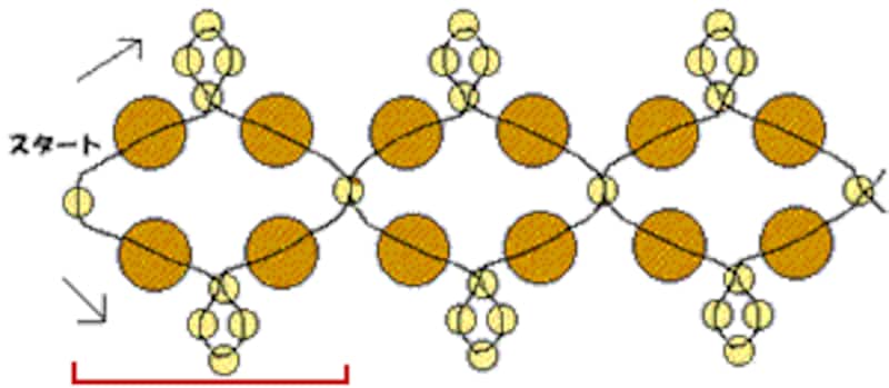 テグスの中央に丸小ビーズを通し、上記図のように編んでいきます。