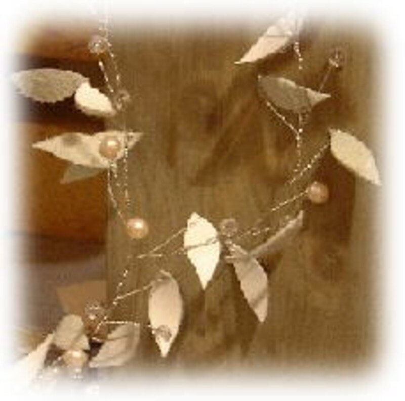 続いてもシャネルパールを使用したロングネックレス(\14,000)です。革でリーフを形どって後ろのリボンも革紐を使用してます。ナチュラル感を前面に出しながら華やかさも忘れてない、パーティーなどで映えるデザインですね。同デザインのショートネックレス(\7,000)やセットアップできるピアス(\3,000)もあります。