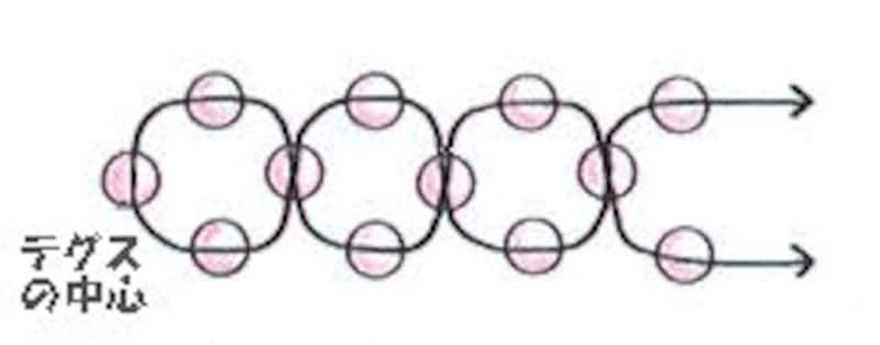 | 別のテグスを★印のパールに通し、両側のパール1個ずつ通します。 ゴールドの丸小ビーズを両側から6個ずつ通し、クロスさせながら1つ先のパールに通します。 同様に11個のクロスを作り、最後は周りのパールビーズにテグスを通し固定させ結びます。(抜けない位通した方が解けた時も抜けにくいです) |