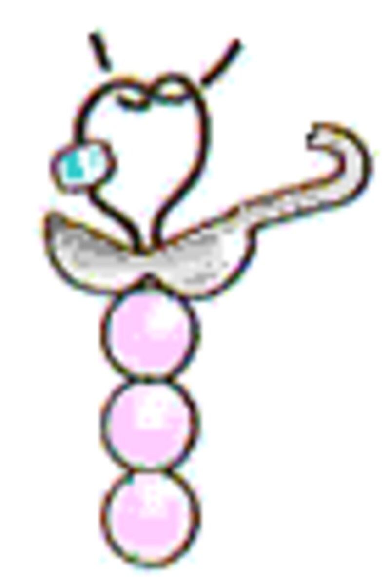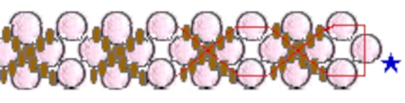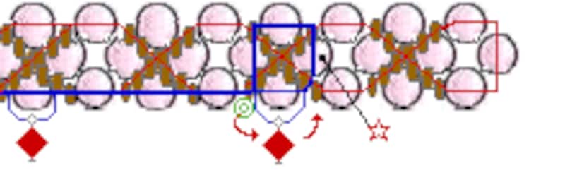 | 4. | 最後にアクセントのスワロフスキーを2.4.6.8.10個目のクロスの下につけます。 まず、以前のCloseUp「ブーツに似合うアンクレット」でも作業しましたようにTピンにスワロフスキーを通します。これを5個用意しておきます。 次に☆印のパールをスタートに図の青のラインのようにクロス飾りのついたパール4つにテグスを通します。 ちょっと見難いんですが、図の◎印で片方のテグスに用意したスワロフスキーを通し、右からパールビーズに通し左に出します。 (この時にテグスに多少緩みがあった方がスワロフスキーがキレイに揺れます) そのまま両方のテグスを左のパールに通し、4個目のクロスで同様に左からスワロフスキーを通します。6.8.10個目のクロスでも同様にスワロフスキーを繋げます。 最後は作業3の終わりのように近くのビーズに通し結んで端の始末をして完成です。 |