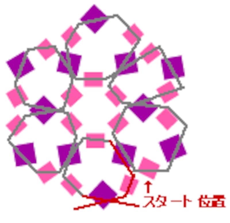 これを6回くらい繰り返し(指のサイズで調整してください)、左図、下の★印にスワロフスキーに通し、テグスを結び、処理して出来上がりです。 |