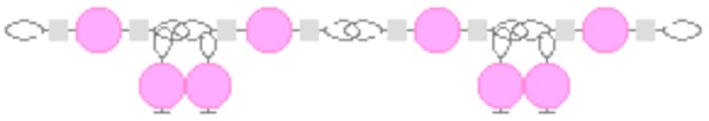 次に飾りのビーズをつけます。Tピンにチェコビーズを通し、作ったネックレスの中央部分に2こずつ吊るします。(下図参照) 間を1つ空けて、左右2ケ所、合計5ケ所に吊るして完成です。 |