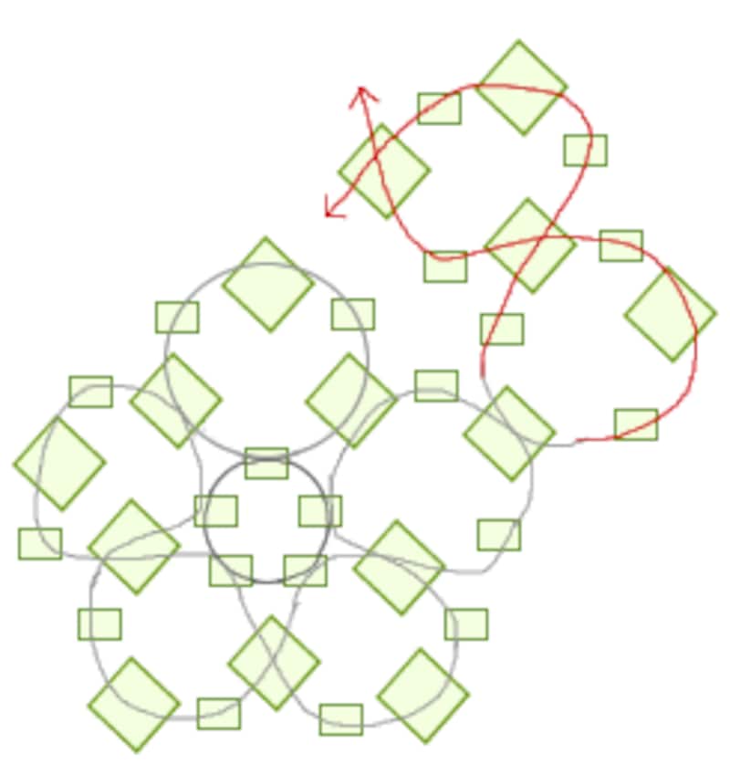 その際、花の中央部分、5つの丸小ビーズを1周するように編んでいくと整いやすくなります。全体の形が整ったらテグスをカットしてモチーフ部分の完成です。 |