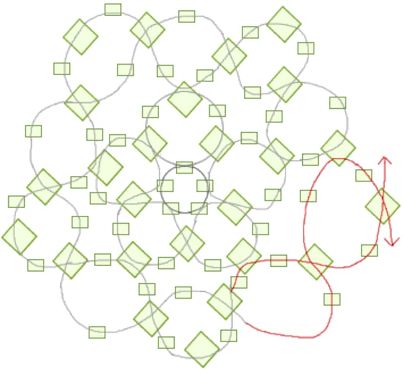 最後に図のように外周に丸小ビーズを通して両方のテグスを硬結びします。