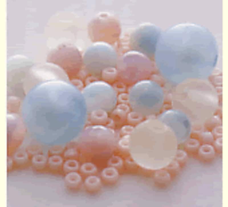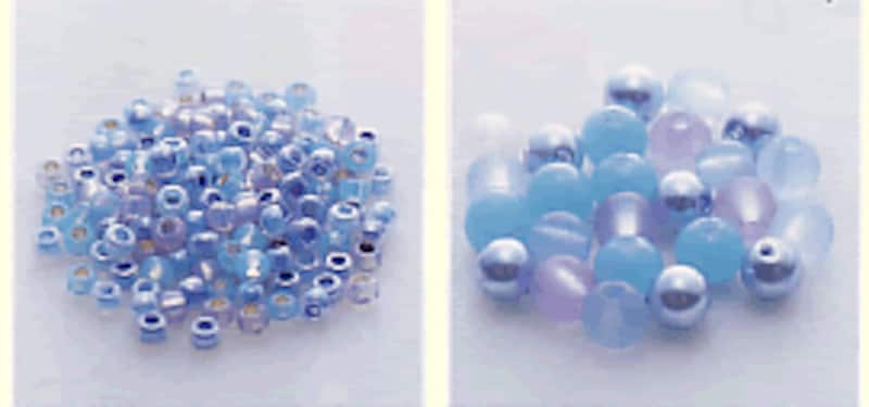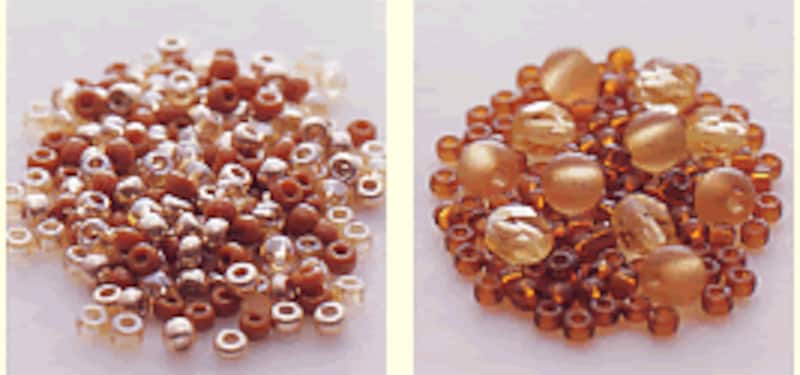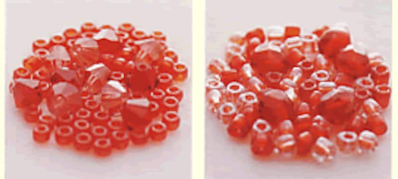 | 同系色のビーズを使って色味を整える「ドミナントカラー配色」にもレッドグループ、オレンジグループなどグループが分けられていて、色味の近いグループとの組み合わせなどを学ぶことが出来ます。 | ![]() |