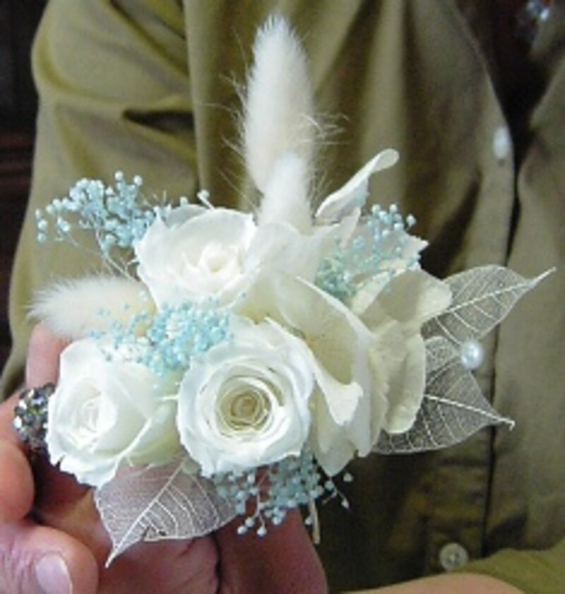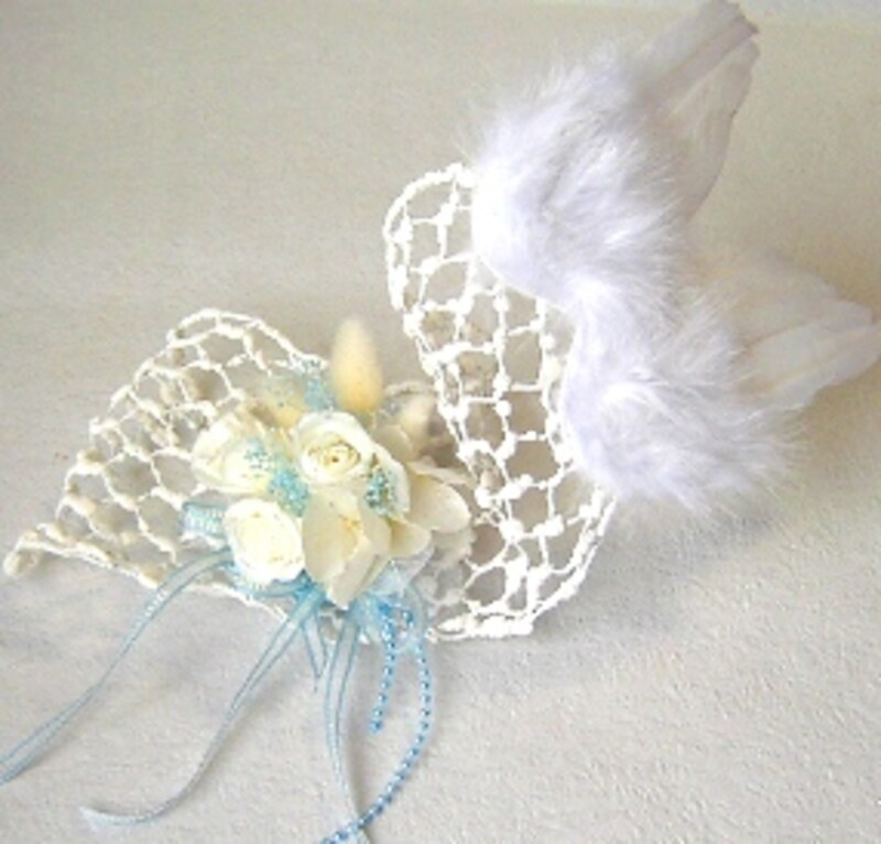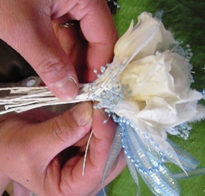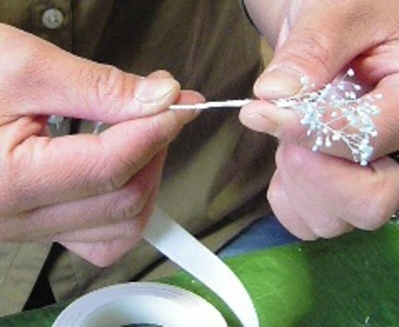 ++「天使の羽」のプチアレンジのつくり方花材にワイヤーをかけます。バラは#24ワイヤーを通してUピンにし、フローラルテープを巻きます。 アジサイ、カスミ草は、#26ワイヤーをUピンにし、茎と一緒に巻き、フローラルテープを巻きます。リボンも同じように作ります。 全てワイヤーとテープが巻けたら、花束を作ります。まとめたところをワイヤーで留めます。しっかり固定出来たら、ワイヤーの上からフローラルテープを巻きおろします。 ミニブーケか出来たところ。巻上げたステム(足)は置いても安定するようにまげておきましょう。 ハニカムボウを花器にしますので、好きな形に整えます。用意した天使の羽をグルーガンで貼りつけ、先に作ったミニブーケのステムとハニカムボウを固体し、セットしたら出来上がりです。 ++今回のアレンジメントのポイント今回のポイントは、ホワイトがメインのピュアなイメージを爽やかに作る事。天使の羽とハニカムボウの使い方もポイントになります。波打つようにハニカムボウに表情を付けると動きが出てよいですよ。ギフトフラワーにもお勧めのアレンジです。++フラワーアレンジメント関連リンク「母の日」のプチアレンジ「桃の節句」のプチアレンジ「和」のバレンタインアレンジ簡単「和」のアレンジに挑戦自分で作るプリザーブドフラワープリザーブドフラワーとは?【編集部おすすめの購入サイト】Amazonでフラワーアレンジメント関連の商品をチェック!楽天市場でフラワーアレンジメント関連の商品をチェック!前のページへ12※記事内容は執筆時点のものです。最新の内容をご確認ください。