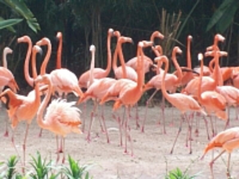 | 熱帯の緑に色鮮やかなフラミンゴがとても映えますね |