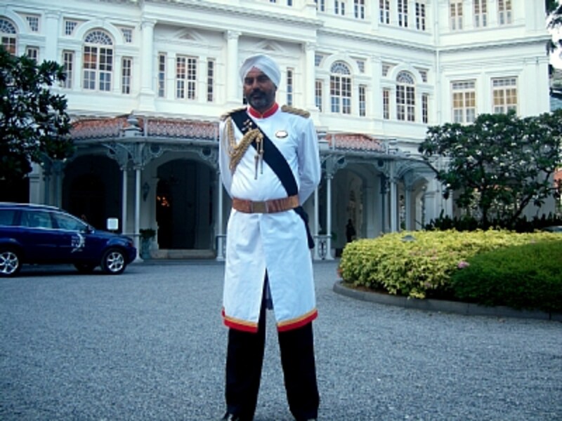 | ラッフルズホテル名物のドアマン。どのガイドブックにも必ずと言ってよいほど彼の写真が掲載されています。記念撮影にも快く応じてくれますよ! |