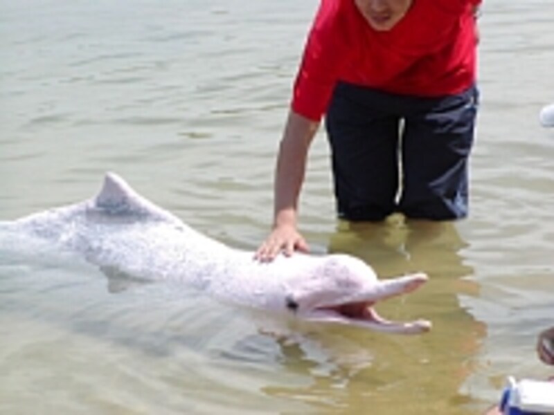 | ショーの最後にはピンクイルカとの触れ合いタイムも! |