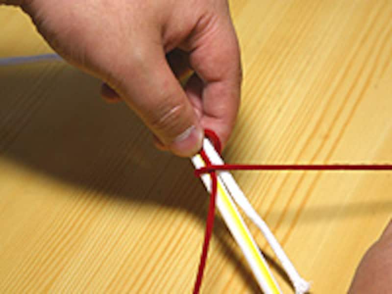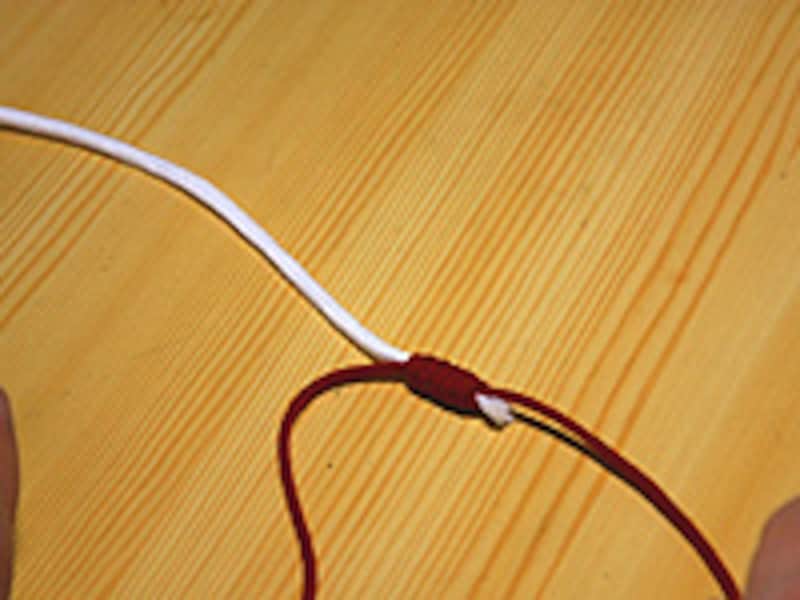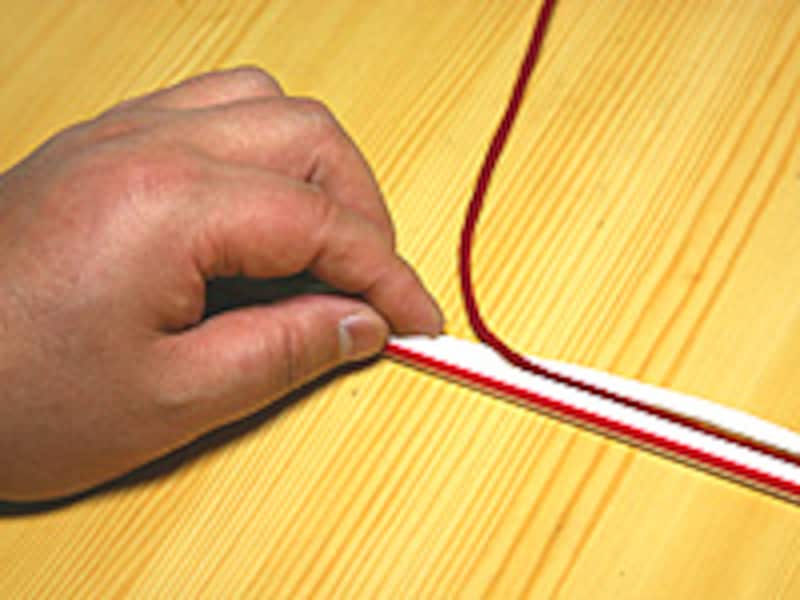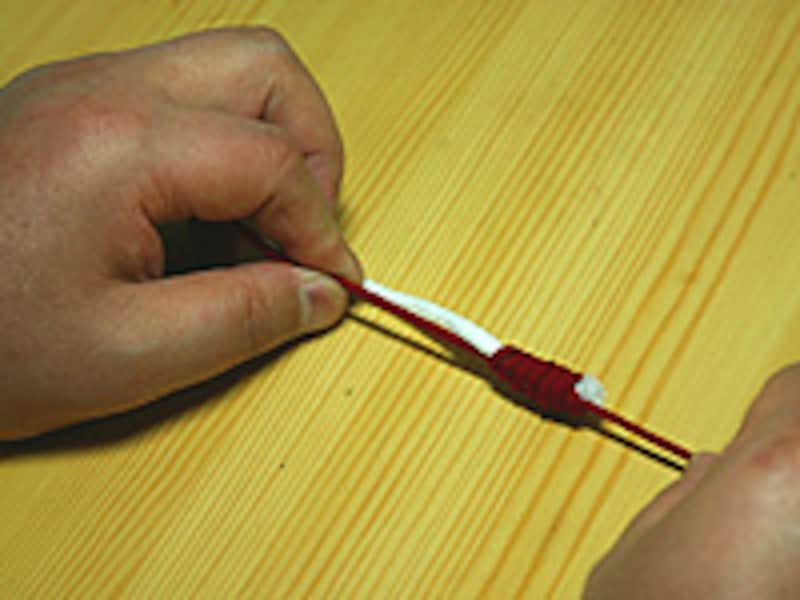 1.白い紐がフライライン、赤い紐がリーダーだ。リーダーの後端と、フライラインの先端を20センチ程度並行にセットし、中空のチューブ(ここではストロー)を置く。チューブとフライラインの先端に合わせておこう。