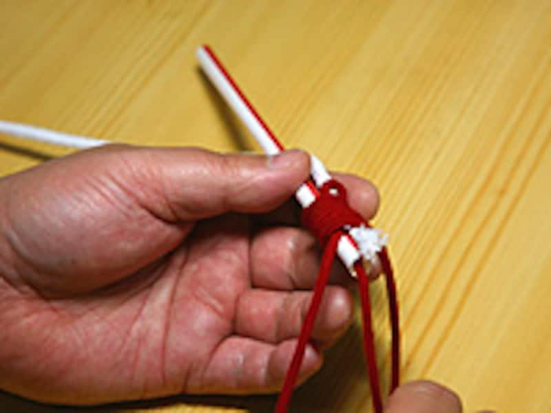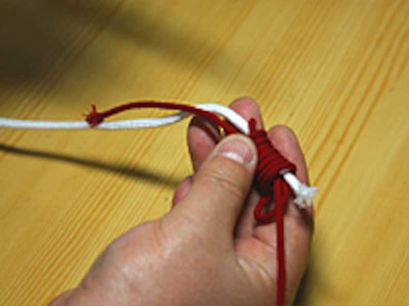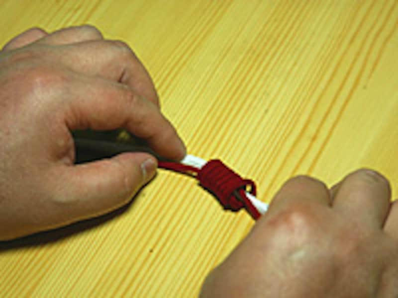 8.ある程度引き絞ったら、全体の形を見ながらさらに両端を引っ張る。ここは目一杯の力で締めこむ感じでOK。それで切れるようなら、失敗なのでやり直そう。