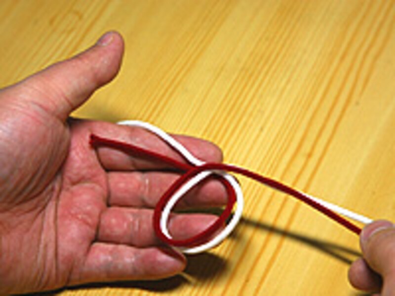 1.白い紐がリーダーの先端で、赤い紐がこれから結ぶティペットだ。まずは両方の先端を20センチ程度平行に合わせよう。